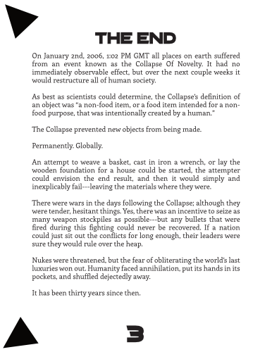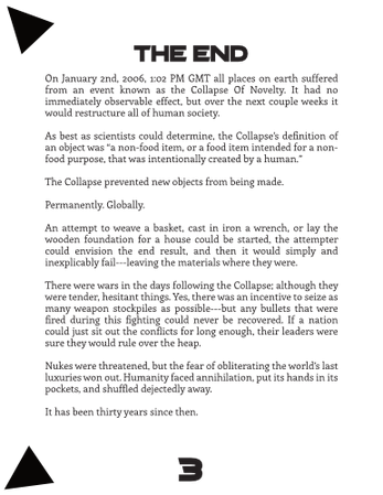 On January 2nd, 2006, 1:02 PM GMT all places on earth suffered from an event known as the Collapse Of Novelty. It had no immediately observable effect, but over the next couple weeks it would restructure all of human society.